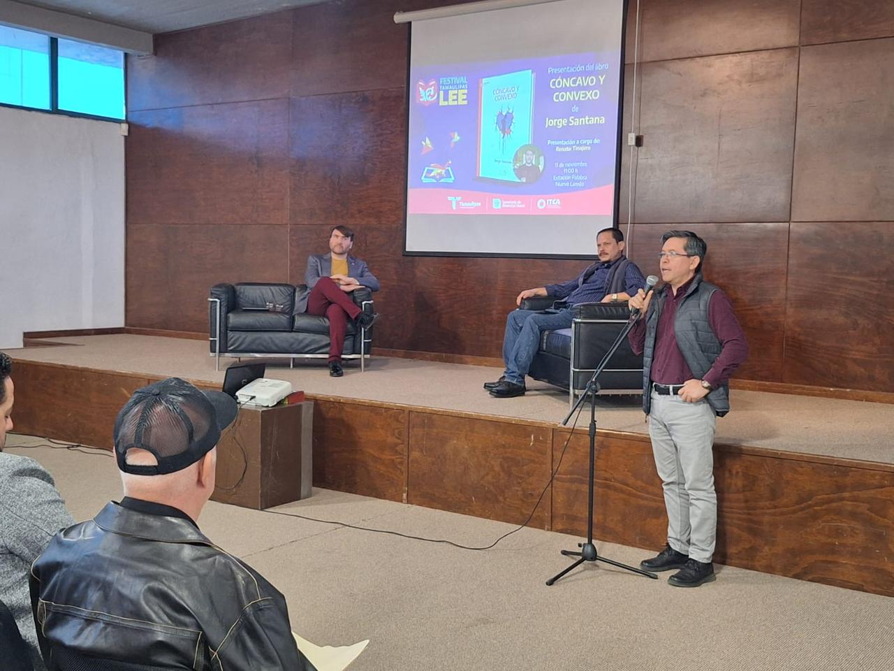 Esta mañana los eventos continuaron con la presentación de «Cóncavo y convexo», libro del poeta neolaredense Jorge Santana, el cual forma parte de las ediciones seleccionadas por el Programa Editorial Tamaulipas 2025. Santana fue presentado por Renato Tinajero dentro de la misma dinámica y convivencia del Festival.