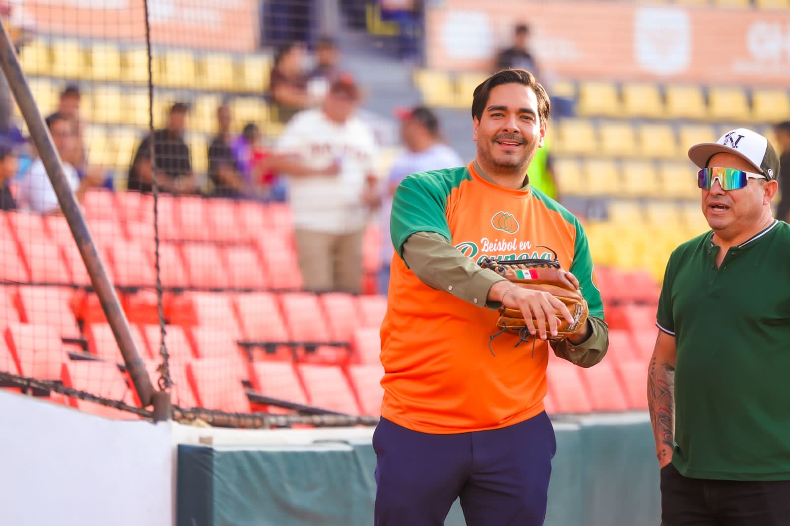 Reynosa, Tamaulipas.- Playbooool! El diamante verde del parque Adolfo López Mateos volvió a hacer eco en sus jardines al lanzar el Presidente Municipal Carlos Peña Ortiz la primera bola del encuentro de la Selección de Reynosa contra los Rieleros de Aguascalientes, conmemorando el 277 Aniversario de la Fundación de Reynosa.