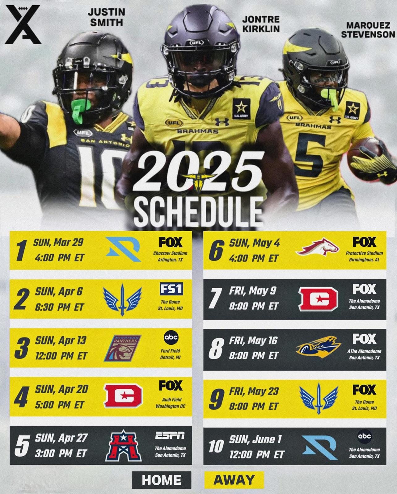 Primer partido en casa: 27 de abril, 14:00 contra los Houston Roughnecks en el Alamodome.