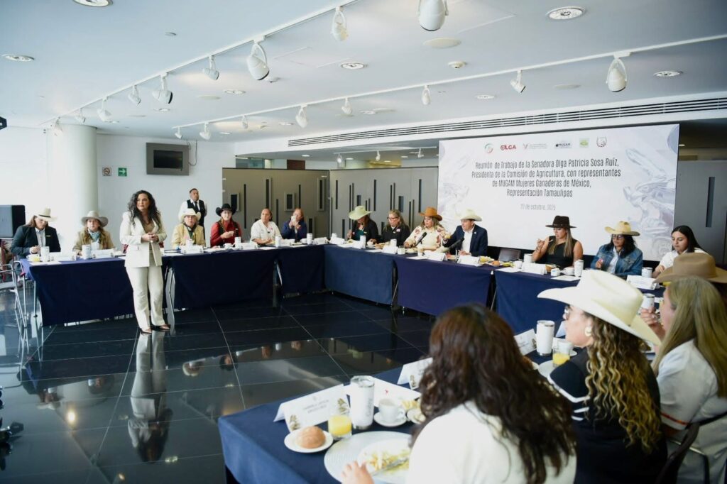 Ciudad de México.- La senadora Olga Sosa Ruíz encabezó en el Senado de la República una reunión de trabajo con integrantes de la Asociación de Mujeres Ganaderas de México (MUGAM) y con el presidente de la Comisión de Ganadería, Sabino Herrera, donde se abordaron los principales retos del sector ganadero, el segundo más importante en la economía productiva de Tamaulipas.