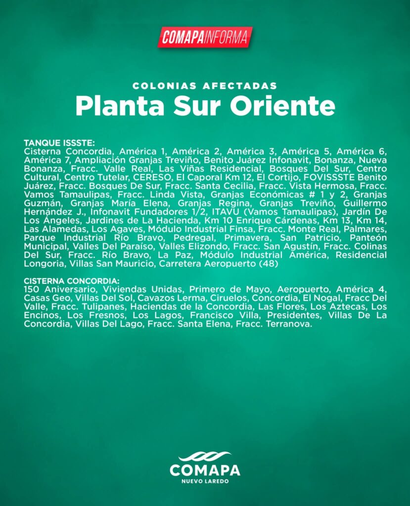 Nuevo Laredo, Tamaulipas.- La Comisión Municipal de Agua Potable y Alcantarillado (COMAPA) de Nuevo Laredo informó que este viernes 30 de enero de 2026, a partir de las 08:00 horas, se realizarán trabajos de mantenimiento en infraestructura hidráulica del sur de la ciudad, como parte del Programa de Mantenimiento Invernal, con una duración estimada de 20 horas.