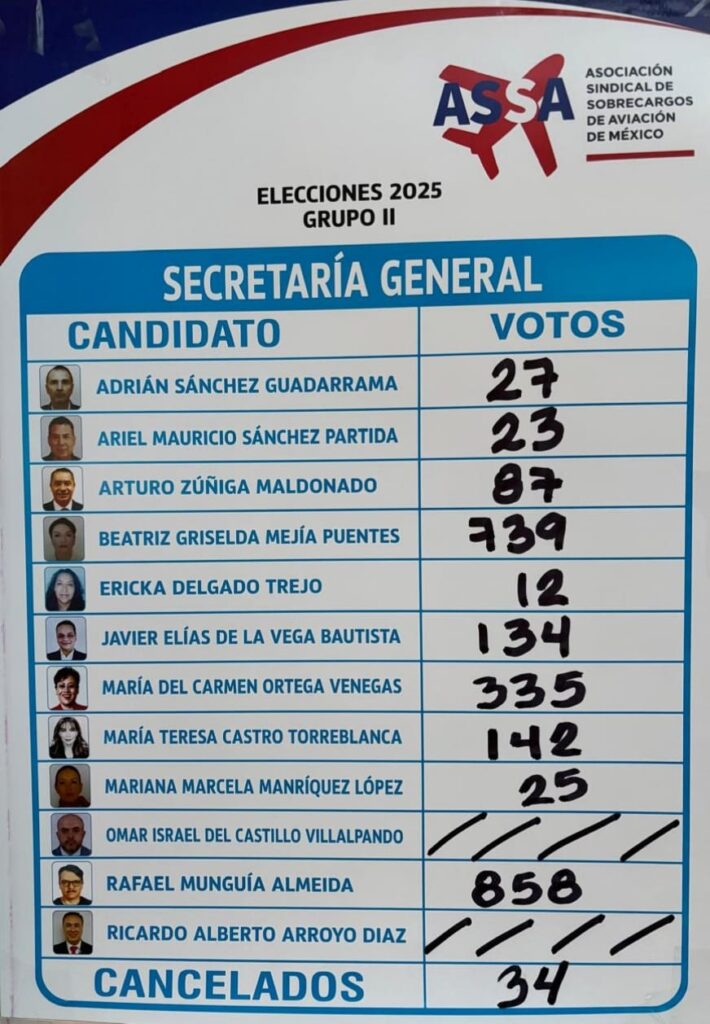 Ciudad de México.- Con una votación cerrada y significativa para el gremio aeronáutico, Rafael Munguía Almeida fue electo como nuevo Secretario General de la Asociación Sindical de Sobrecargos de Aviación (ASSA) de México), al obtener 857 votos, frente a los 739 de su más cercana contendiente.