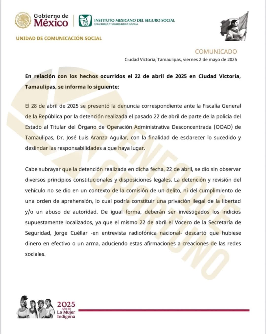 El Dr. Aranza Aguilar fue detenido el 22 de abril en Ciudad Victoria en un operativo encabezado por fuerzas estatales, en circunstancias que el IMSS calificó como “irregulares” y alejadas de los principios constitucionales.