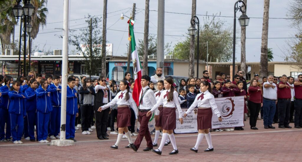 «Hoy refrendamos nuestro compromiso de servir con responsabilidad y amor por México, fortaleciendo los valores que nos unen como nación”, expresó la alcaldesa ante la comunidad escolar y los integrantes del Cabildo que la acompañaron.