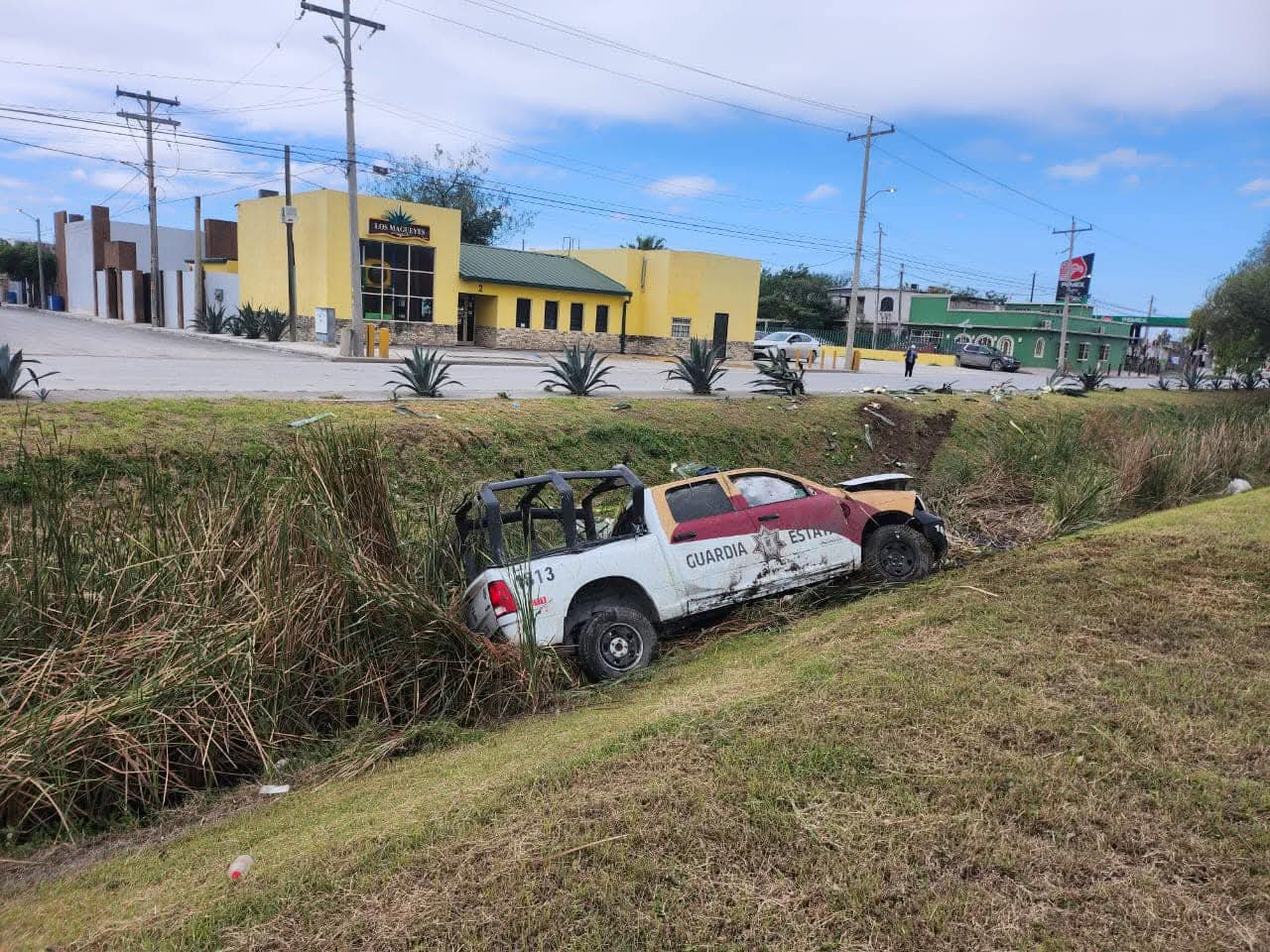 Matamoros, Tamaulipas.- Una Unidad de la Guardia Estatal de Tamaulipas vuelca en Matamoros, tras persecución con civiles armados, reporta la Vocería de Seguridad.